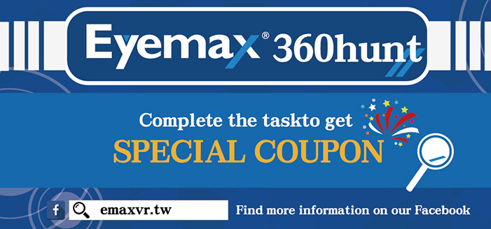 Eyemax specially planned Eyemax 360 hunt activities, as long as the completion of the specified task on the FB or shop in the experience to use VR headset to complete the specified task site, you can get a free coupon or discount of 50NT limited time benefits!